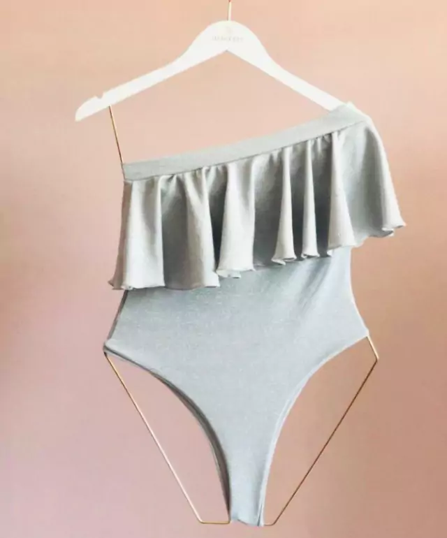 O body positano é confeccionado em lurex com babado em um ombro só traduzindo